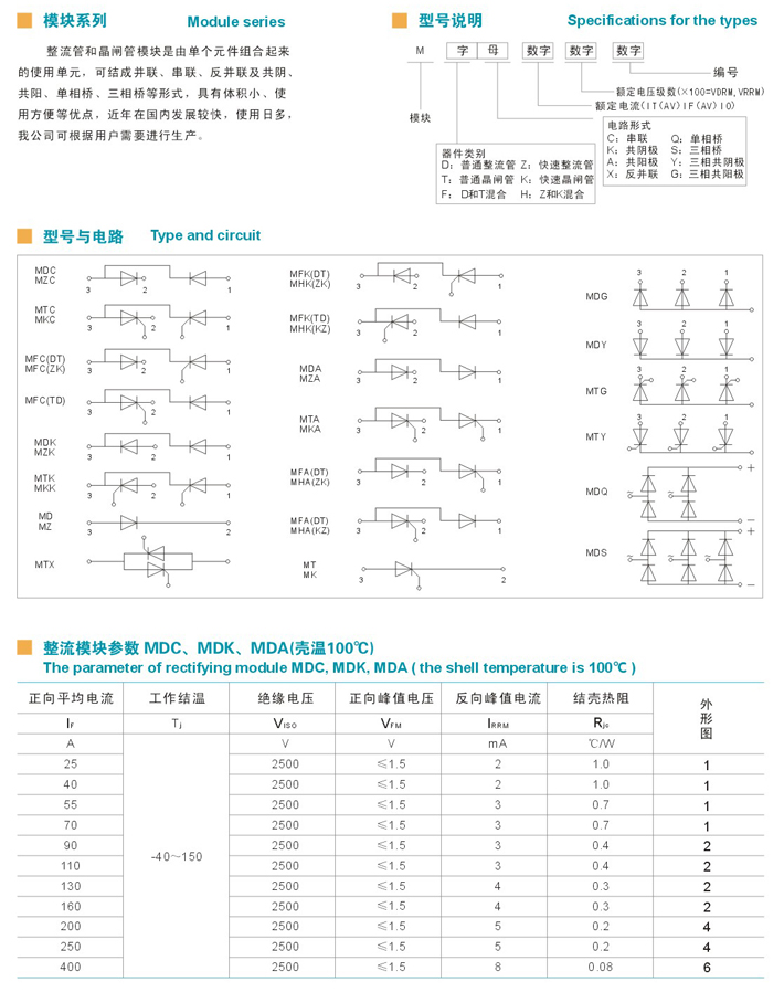 整流模块参数MDC、MDK、MDA(壳温100℃)