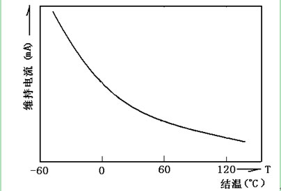 维持电流是温度的函数。随温度升高而减小,而且变化的幅度较大。应用者在使用时,应加以充分考虑,见(图三)。出厂提供的维持电流是在室温时测出的。